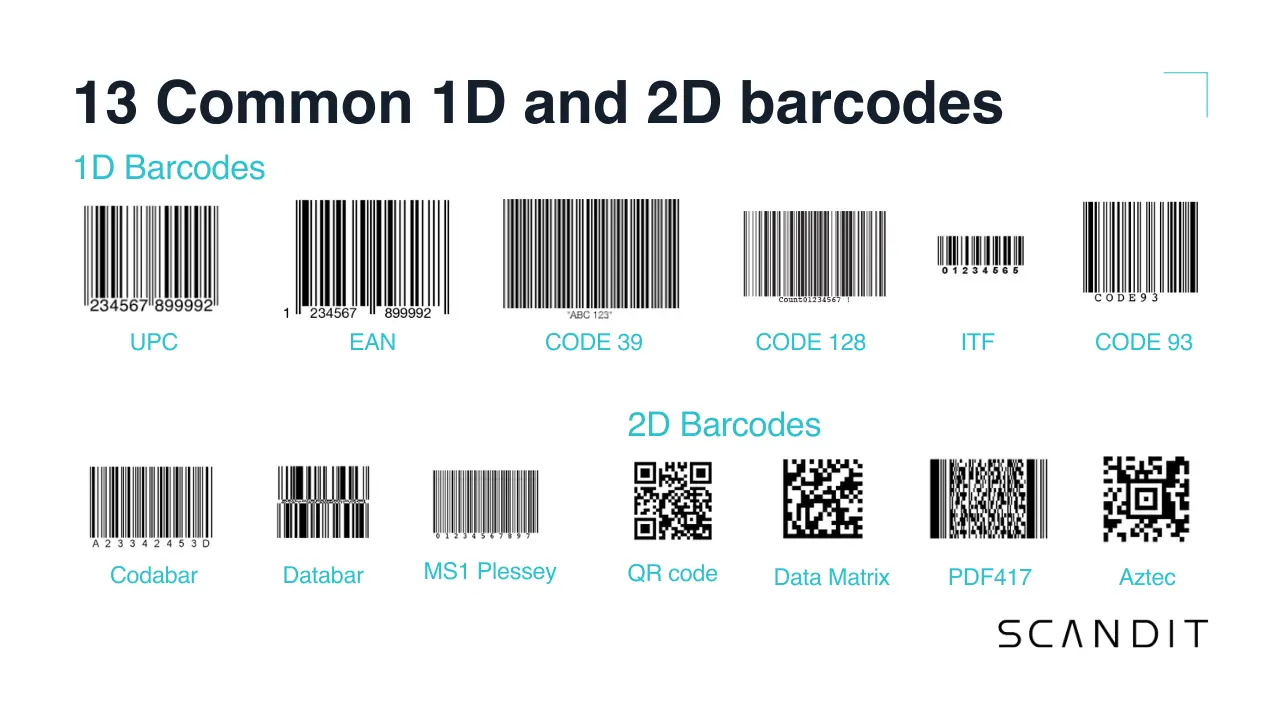 Examples UPC-A, EAN-13, Code 39 QR Code, Data Matrix, PDF417