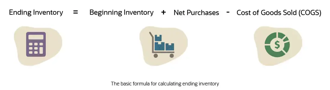 Ending Inventory = Beginning Inventory + Net Purchases – Cost of Goods Sold (COGS)