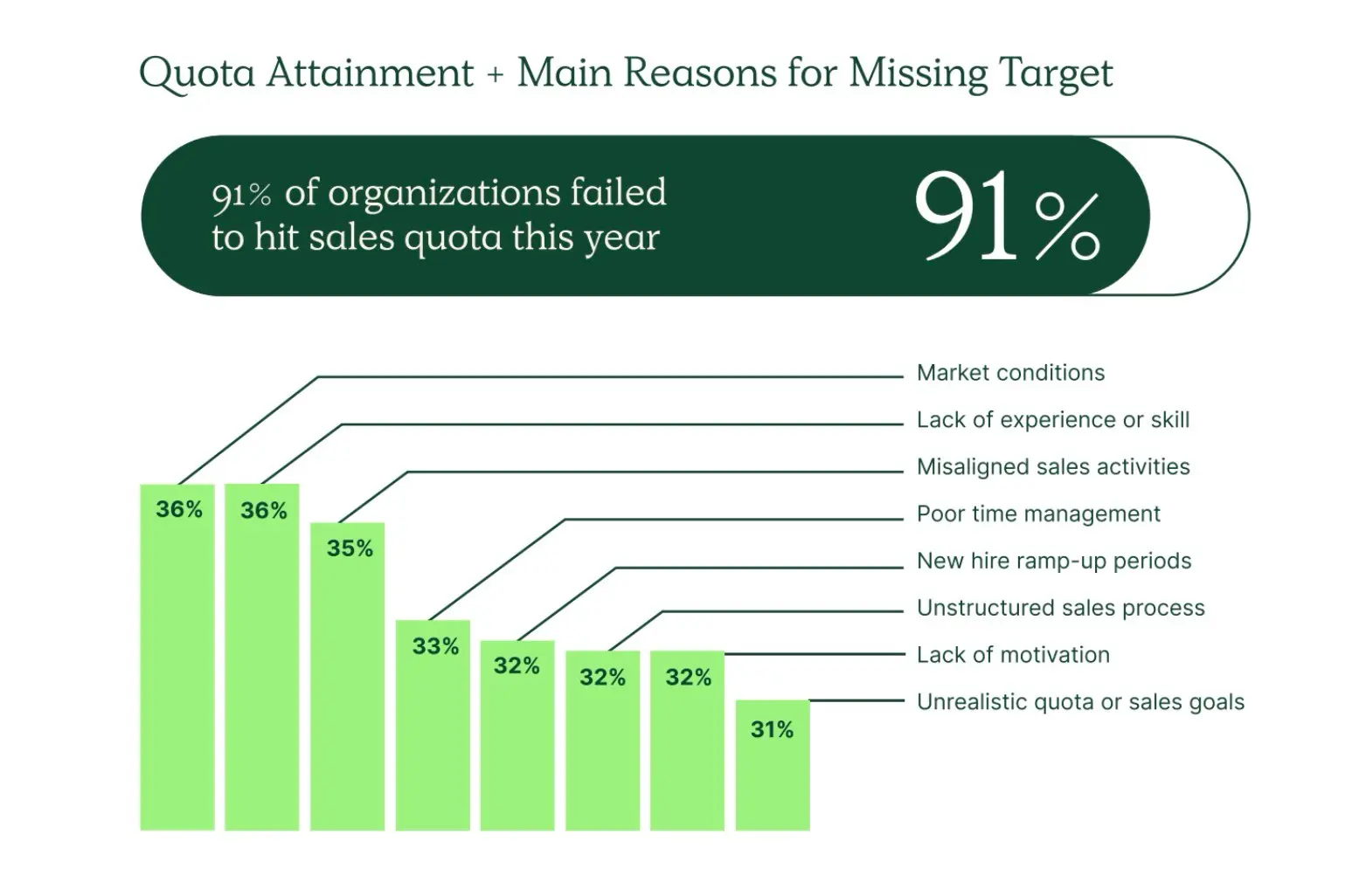 According to Wall Street Prep, 91% of companies fail to achieve their sales quota due to multiple reasons given below:
