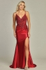This Satin sleeveless dress is crafted from a satin-polyester blend, delivering a smooth, glossy finish ideal for formal occasions. The design features thin spaghetti straps and a V-shaped embroidered illusion bodice, incorporating detailed beadwork and semi-sheer mesh panels for added texture and sophistication. The bodice structure offers support and enhances the shape, providing a flattering fit across the upper body.