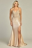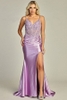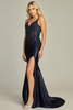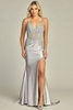 Satin sleeveless dress satin-polyester blend, spaghetti straps, embroidered illusion bodice, high side slit, individual packaging for retail.