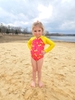 Girls zip swimsuit Long sleeve one-piece with front zipper, UPF 30+, full lining, high-visibility neon fabric, 154.5g unit weight, made in China.