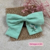 Hair Bows are handmade hair accessories crafted from linen fabric and feature embroidered floral designs. Each bow is securely attached to a stretchy hair tie, ensuring flexibility for different hair types while providing a secure hold. The linen material is soft and breathable, designed to minimize friction and be gentle on hair during extended wear.