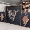 Highlander cow three‑piece wooden wall art set with engraved Highland cow and tribal Aztec motifs, custom stain options, birch wood panels with pine frames, handcrafted in the USA.