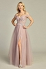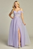 This A-line dress features an off-shoulder neckline with an illusion mesh overlay and embroidery accented with beads. The bodice offers partial transparency for a layered visual effect. The full-length skirt incorporates a glitter sparkle finish and includes a thigh-high slit for added mobility and modern styling.