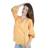 Linen blouse top, V‑neck embroidered design, puffed 3/4 sleeves, breathable linen, made in India, packaged individually.