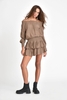 This mini skort is constructed from soft terry cloth fabric and features a high-rise design with an elastic waistband for flexible and secure wear. The exterior presents a skirt-like appearance with a straight hem, while the interior includes built-in shorts for added coverage and functional support. The skort sits above the thigh, offering comfort and mobility in casual or athleisure settings.