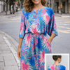 Poly Spandex Dress Polyester-spandex blend, UPF 50+ sun protection, V-neck shift mini silhouette, printed design; retail unit for resort wear.