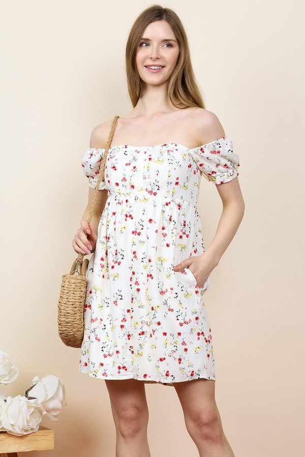 6 per style: In packs of XS(1), S(2), M(2), and L(1) per color only. floral off shoulder mini dress