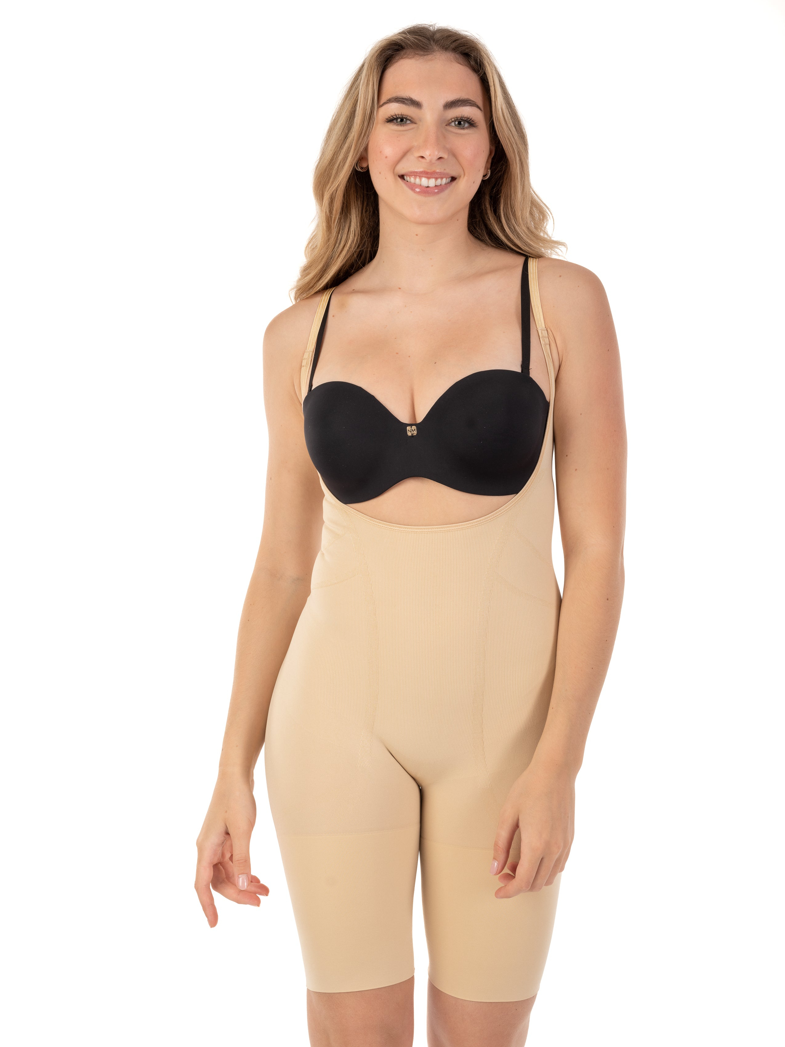 This bodysuit shaper is made from a seamless knit blend of nylon and spandex, designed for light-to-moderate compression across the waist, abdomen, and back. It features a scoop neckline, adjustable shoulder straps, and a full brief bottom for extended coverage and shaping. The pull-on style supports smooth layering under apparel without visible seams or fasteners.