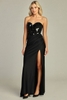Sheath dress, strapless sweetheart neckline, mirror piece top, floor length, high slit, pleated detail, corset and ruched back, sizes XS–2XL, labeled.