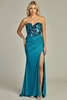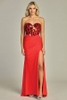 This sheath-style formal dress features a strapless sweetheart neckline highlighted by mirror piece embellishments across the bodice. The silhouette is floor-length with a high side slit for movement and modern styling. Pleated detailing shapes the front, while the back includes a ruched design and adjustable corset closure for structure and fit.