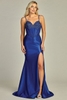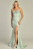 Sweetheart neck dress satin-polyester blend, sleeveless with spaghetti straps, embellished bodice, high side slit, individual packaging for retail.