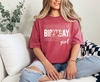 The Birthday Girl Shirt in banana yellow, front graphic with layered text and ribbon print, crewneck style, single-unit packaging