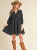 Tiered dress, made of 100% cotton with 3/4 sleeves, hand-wash care, made in China, 0.68 kg, available in Black, Lilac, Mint, and White.