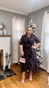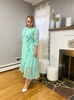 Chiffon dress, Polka dot print, White and green, V-neckline, Faux wrap style, Tie waist, 3/4 puff sleeves, Midi length dress, ruffle detailing.