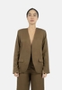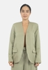 Women's blazer made from polyester blend, tailored fit with notched lapel and single-breasted closure, sage green color, dry clean only, individually packaged.