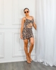 The Shredded Cinched Mini Dress is constructed from stretch polyester, offering a snug fit that conforms to various body types. It features a floral print and cut-out sides, adding visual interest. Adjustable spaghetti straps allow for a customizable fit. The dress is available in sizes small to large and comes in black or peach color options.
