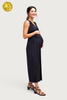 The sleeveless design includes a self-tie waist feature for adjustable shaping. It is available in three color options: black, marine blue, and polka d...