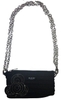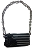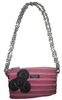 Lily bag made from striped nylon zipper fabric, 7.5" x 5" x 3", vegan, ethically sourced, machine washable, removable silver chain, recyclable packaging, sold as small cocktail bag.