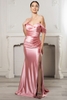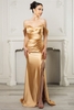 Off the shoulder dress, stretch satin polyester, full-length sheath with side slit, sweetheart neckline, single garment packaging.