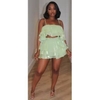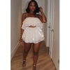 This shimmer ruffle two-piece set is made in the United States and includes a coordinated top and mini skirt. The fabric features a shiny, light-reflective finish suited for spring and summer wear. Both pieces incorporate tiered ruffle elements, creating a layered silhouette with textural movement.
