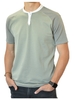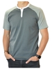 Short sleeve Henley t-shirt, 60% cotton, 35% polyester, 5% elastane, sea gray body with white collar and sleeve ends, machine washable.
